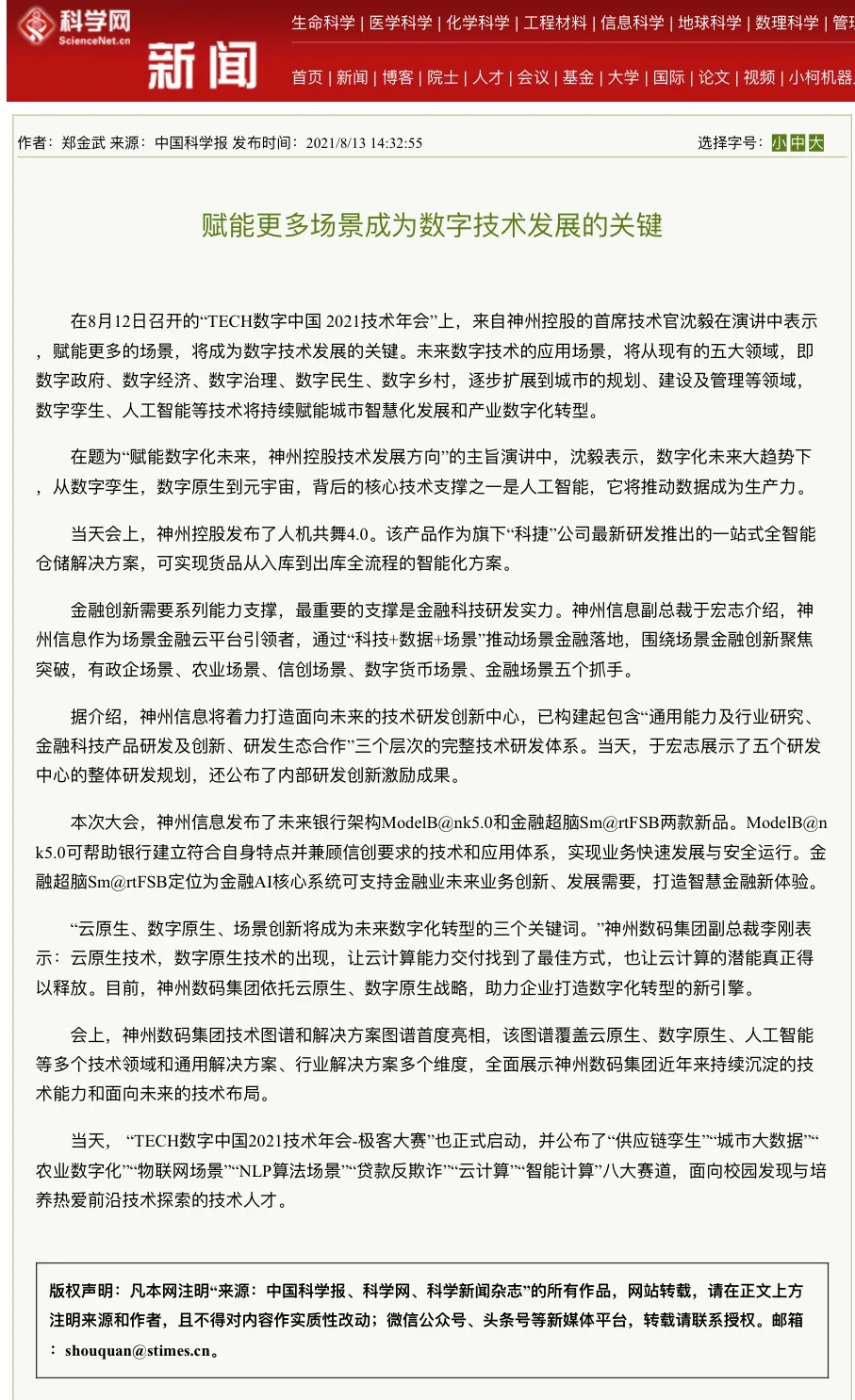 8月12日,由神州控股、神州信息、710公海寰宇集团联合主办的“科技自强、数据融通、场景创新——TECH数字中国 2021技术年会”云上盛大启幕,发布神州信创云、ModelB@nk5.0、金融超脑Sm@rtFSB、云原生数字化安全底座、园区智能体等重磅产品,国内各大权威、影响力媒体多角度多频次对盛况进行报道!