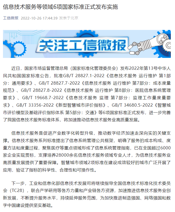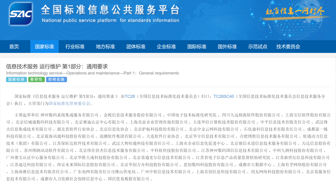 近日,国家市场监督管理总局(国家标准化管理委员会)发布2022年第13号中华人民共和国国家标准公告,批准神州信息牵头编写的GB/T 28827.1-2022《信息技术服务 运行维护 第1部分:通用要求》(以下简称《通用要求》)等6项国家标准正式发布,进一步完善了我国信息技术服务标准体系,将加速推动信息技术服务业高质量发展。