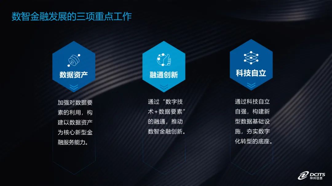 产业数字化为我们的金融服务打开了新的蓝海,但是能否在新蓝海中抢占先机,需要银行充分结合自身的优势、特点和能力。而我们神州信息作为一家金融科技企业,面对数智金融的发展,我们能不能抓住这个新机遇?我认为只要我们能做好三方面的工作,答案就是肯定的。
